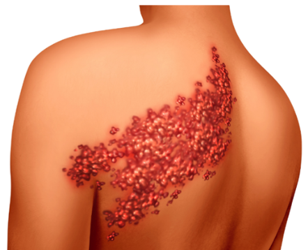 وتتكَوَّن قُشُور تَسقُط لَاحقاً وقد تُؤدِّي إِلى حَكَّة مُزعجَة.